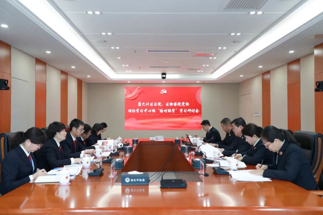 为深入开展学习贯彻习近平新时代中国特色社会主义思想主题教育,全面落实党组理论学习中心组“结对联学”工作机制,推进由“关门独家学习”向“开门共同学习”转变,在认真落实党组理论学习中心组学习制度的基础上积极探索素质能力提升工程新举措,康巴什区法院、区检察院召开党组理论学习中心组“结对联学”学习研讨会。区法院党组书记、院长王率、区检察院党组书记、检察长额尔登达来分别作讲话。