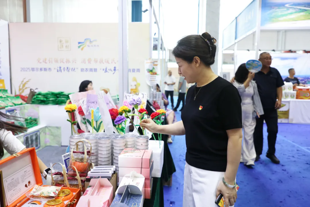 活动现场热闹非凡。农产品展示区内,各类优质农副产品陈列有序,涵盖饱满的米面粮油、新鲜的瓜果蔬菜及香气浓郁的卤味熟食等千余种产品,品类丰富;美食品鉴区亦吸引了大量市民驻足品鉴。康巴什区人民检察院的党员干部们积极融入活动,主动采取“以购代销”“以买代帮”的方式,踊跃投身消费帮扶工作,以实际行动彰显了党建在消费帮扶中的引领作用。