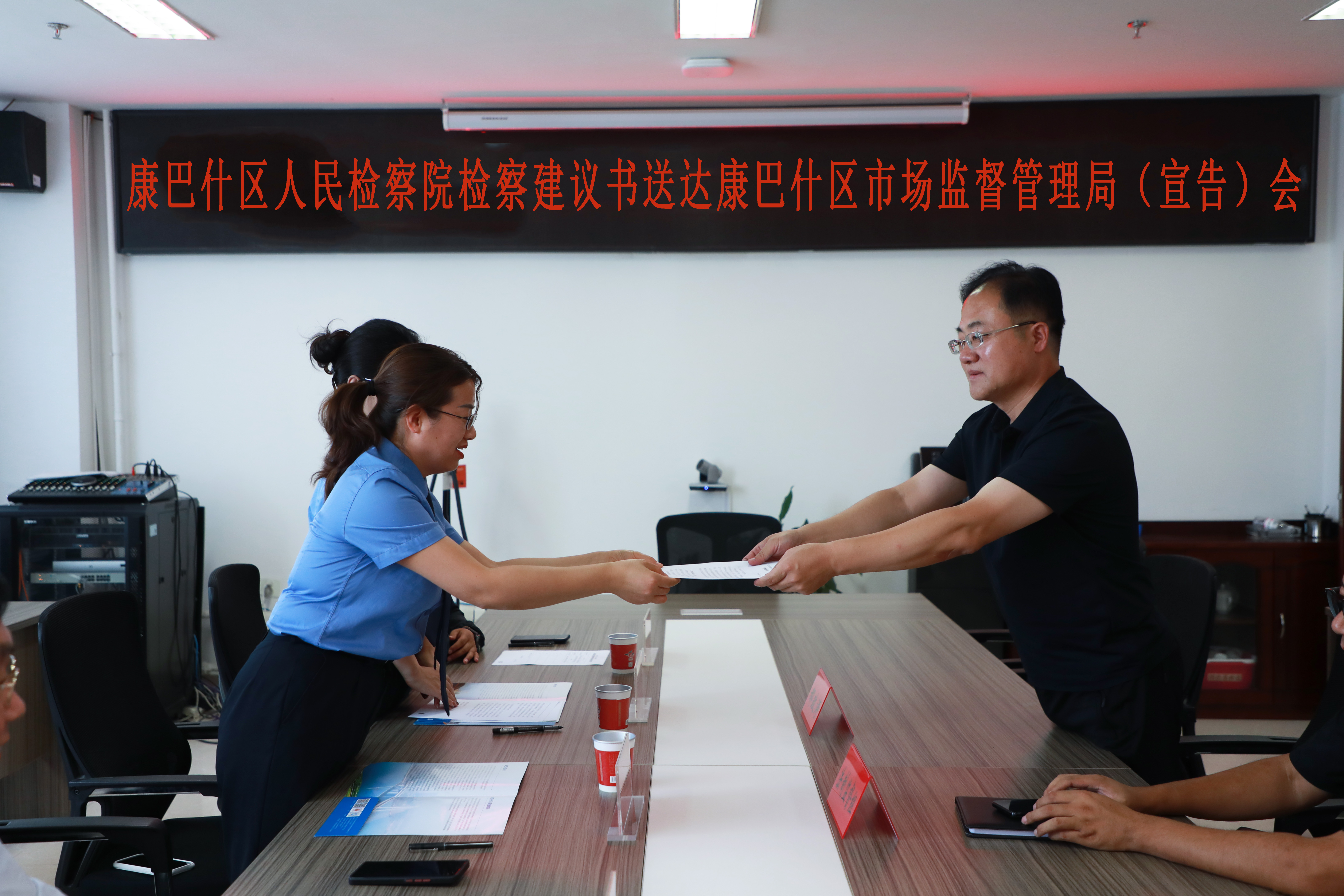 2025年9月8日,我院依法向康巴什区市场监督管理局公开宣告并送达检察建议书。该局副局长代表单位接收文书,人民监督员全程见证,送达程序规范、严肃透明。